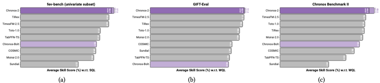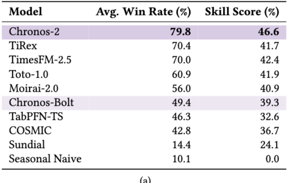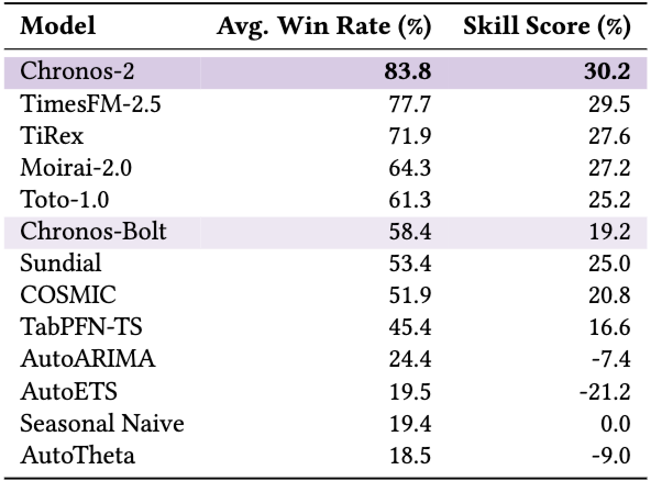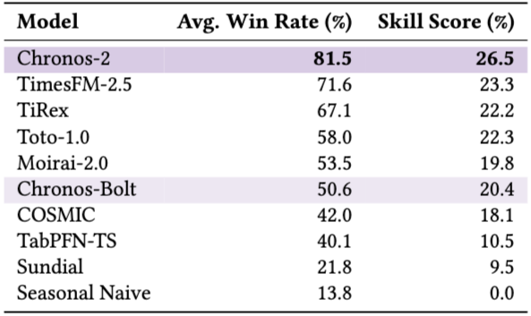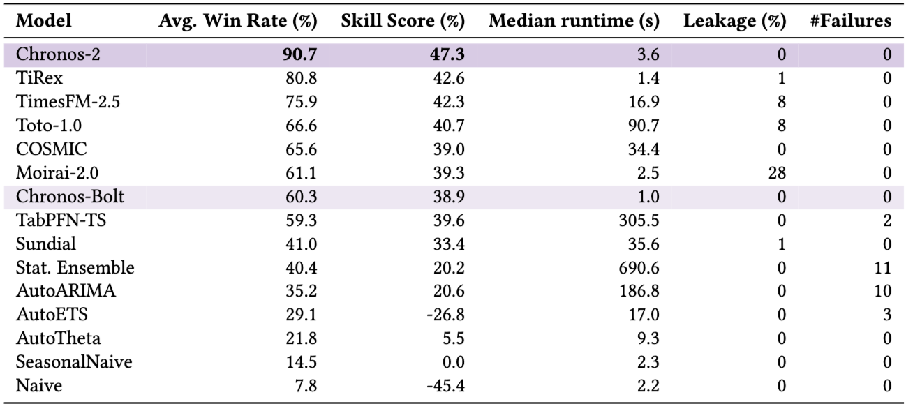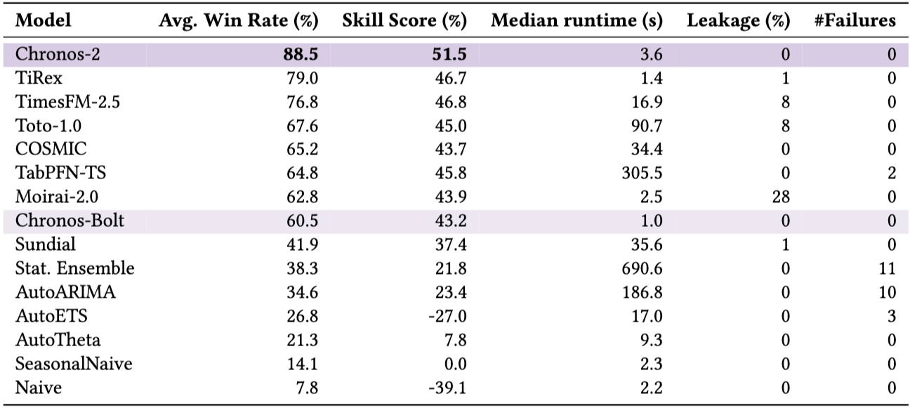์ด ๋ฒค์น๋งํฌ์์๋ Chronos-2๋ WQL ๋ฐ MASE ๊ธฐ์ค์์ ๋ชจ๋ ๊ธฐ์กด ๋ชจ๋ธ์ ์ผ๊ด๋๊ฒ ๋ฅ๊ฐํฉ๋๋ค(ํ 5 ์ฐธ์กฐ).