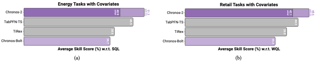 ๊ฒฐ๊ณผ์ ์ผ๋ก Chronos-2๋ ๋ชจ๋ ๊ฒฝ์ฐ์์ ๊ธฐ์ค์ ๋ชจ๋ธ์ ์ผ๊ด๋๊ฒ ๋ฅ๊ฐํ๋ฉฐ, ๊ณต๋ณ๋ ํตํฉ์ด ์ค์ ์์ธก ์ฑ๋ฅ์ ๋งค์ฐ ์ค์ํจ์ ๋ณด์ฌ์ค๋๋ค.