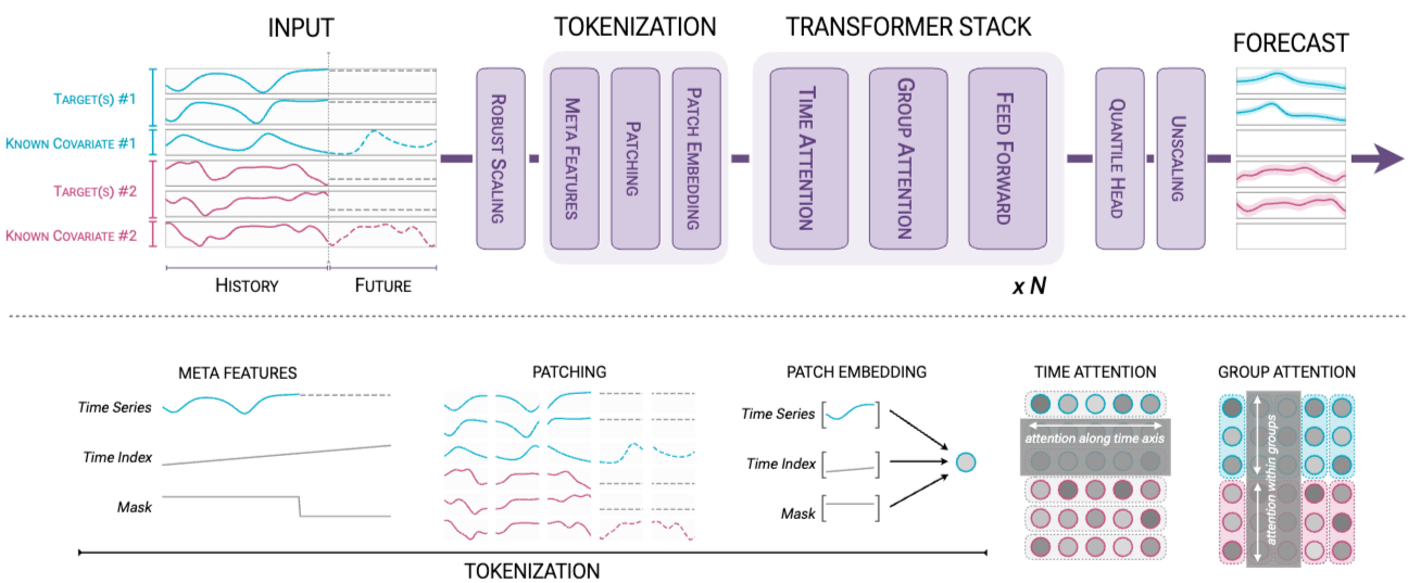 - ๊ธฐ์กด Pretrained๋ชจ๋ธ์ Univariate forecastingํ๊ณ๋ฅผ ๋์ด, multivariate ๋ฐ covariate-informed forecasting task๋ฅผ zero-shot๋ฐฉ์์ผ๋ก ์ฒ๋ฆฌํ๋ ๋ฒ์ฉ ๋ชจ๋ธ