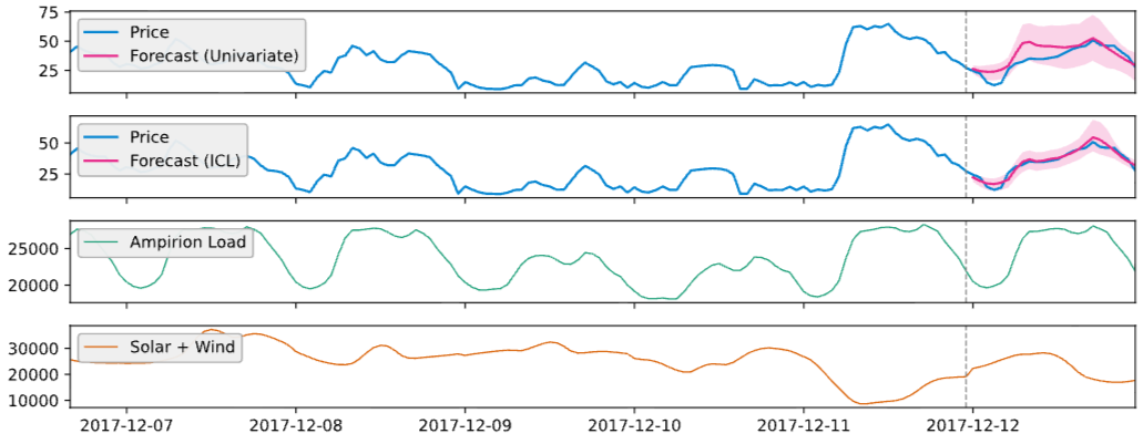 - In-Context Learning(ICL) : ์ฌ๋ฌ ์๊ณ์ด์ ํ๋์ ๊ทธ๋ฃน์ผ๋ก ๋ฌถ์ด ๋ฐฐ์น์ ๋ฃ์ผ๋ฉด, ๋ชจ๋ธ์ ๊ทธ๋ฃน ๋ด ๋ค๋ฅธ ์๊ณ์ด๋ก๋ถํฐ ํํธ๋ฅผ ์ป์(๊ณต๋ณ๋ ํน์ ๋ค๋ณ๋์ผ๋ก๋ถํฐ)