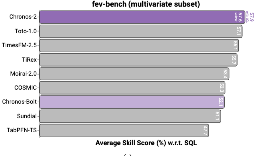 - ๋ค์ํ ๋ฒค์น๋งํฌ์์ SOTA๋ฅผ ๋ฌ์ฑํ์ผ๋ฉฐ, covariate-informed task์์ ๊ธฐ์กด chronos ๋ณด๋ค ํฐ ํญ์ ๊ฐ์ ์ ๋ณด์ฌ์ค