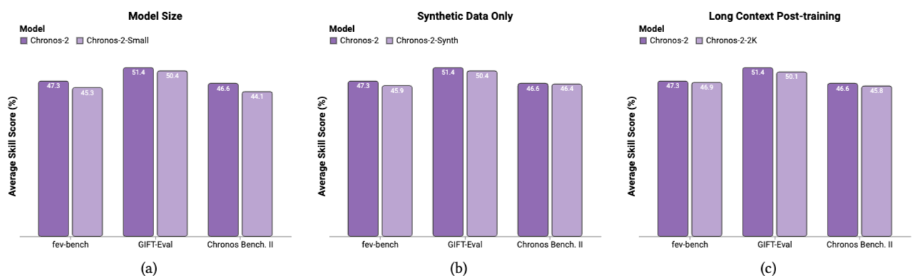 ์ผ๋ฐํ ์ฑ๋ฅ์ ํฅ์์ํค๋๋ฐ, ํฉ์ฑ ๋ฐ์ดํฐ๊ฐ ๋ชน์ ์ค์ํ๋ค. ์ด๋ chronos-2๊ฐ ๋จ๋ณ๋ ์์ธก์ ๋์ด์๋ ์์ธก์ ํ๊ฒ ํ๋ ํต์ฌ์ ์ธ ์ญํ ์ด์๊ณ , ์ด๋ ์ถํ ํฉ์ฑ ๋ฐ์ดํฐ๊ฐ ํฅํ ์๊ณ์ด ๋ชจ๋ธ์์ ํต์ฌ์ ์ธ ์ญํ ์ ์ํํ ๊ฒ์ ์์ฌํ๋ค.
