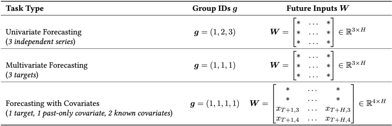- Group Attention : ๊ด๋ จ ์๊ณ์ด๋ค์ ์์์ ์งํฉ, ๋ค๋ณ๋ ์๊ณ์ด์ ๊ฐ ๋ณ๋, ์์ธก ๋์๊ณผ ๊ณต๋ณ๋(๊ณผ๊ฑฐ or ๋ฏธ๋์ ๊ฐ์ด ์๋ ค์ง ๊ฒฝ์ฐ)๋ฅผ ํ๋์ ๊ทธ๋ฃน์ผ๋ก ๋ฌถ์ด ๊ทธ๋ฃน ๋ด๋ถ์์ ์ ๋ณด ๊ตํ์ ๊ฐ๋ฅํ๊ฒ ๋ง๋ค์๋ค.