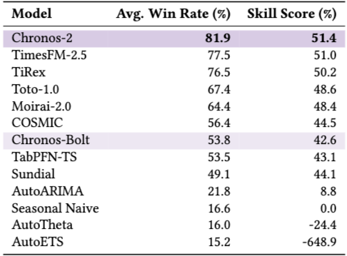 ํ 4์ ๊ฒฐ๊ณผ์ ๋ฐ๋ฅด๋ฉด Chronos-2๋ ๊ฐ์ค ๋ถ์์ ์์ค(WQL)๊ณผ ํ๊ท ์ ๋ ์ค์ผ์ผ ์ค์ฐจ(MASE) ๋ชจ๋์์ ์ด์ ์ต๊ณ ์ฑ๋ฅ ๋ชจ๋ธ์ ๋ฅ๊ฐํฉ๋๋ค.