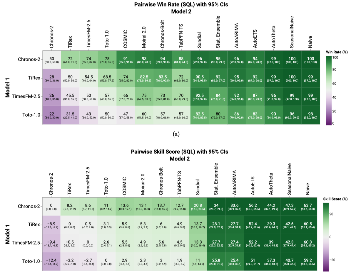 fev-bench๋ ๋ชจ๋ธ ๊ฐ ์ฑ๋ฅ ์ฐจ์ด๊ฐ ํต๊ณ์ ์ผ๋ก ์ ์๋ฏธํ์ง๋ฅผ ํ๊ฐํ ์ ์๋ ๋๊ตฌ๋ฅผ ์ ๊ณต ๊ทธ๋ฆผ 2์ ์ ์๋ 95% ์ ๋ขฐ๊ตฌ๊ฐ ๋ถ์ ๊ฒฐ๊ณผ๋ Chronos-2๊ฐ TiRex ๋ฐ TimesFM-2.5๋ฅผ ํต๊ณ์ ์ผ๋ก ์ ์๋ฏธํ ์ฐจ์ด๋ก ๋ฅ๊ฐํจ