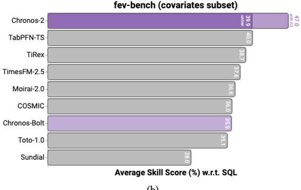 ICL์ ํตํด Chronos-2๋ ๊ณต๋ณ๋ ์ ๋ณด๋ฅผ ํจ๊ณผ์ ์ผ๋ก ํ์ฉํ์ฌ ๋จ๋ณ๋ ์ถ๋ก ๋๋น ํฐ ์ฑ๋ฅ ๊ฐ์ ์ ๋ฌ์ฑํฉ๋๋ค.